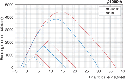 The flexural strength of MS-hi105 (standard type) and MS-hi will be as shown on the right figure. (For representation, values for 1000mm pile diameters are shown.)