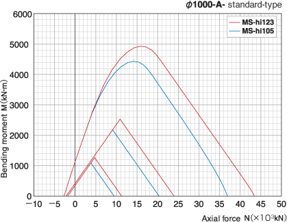 The flexural strength of MS-hi105 (standard type) and MS-hi123 (standard type) will be as shown on the right figure. (For representation, values for 1000mm A-type standard form pile diameters are shown.)